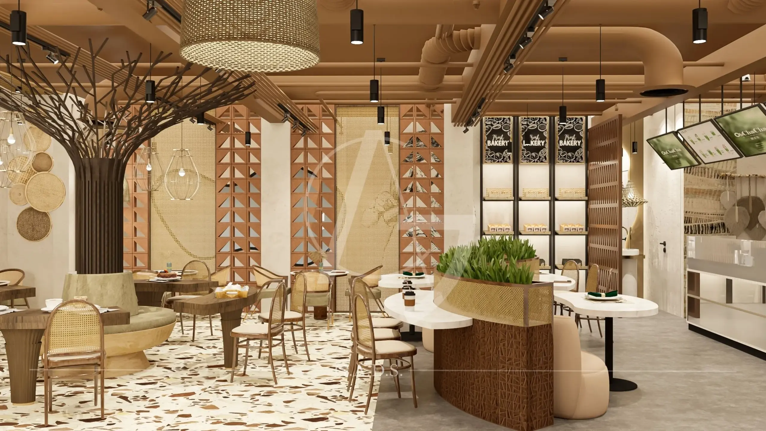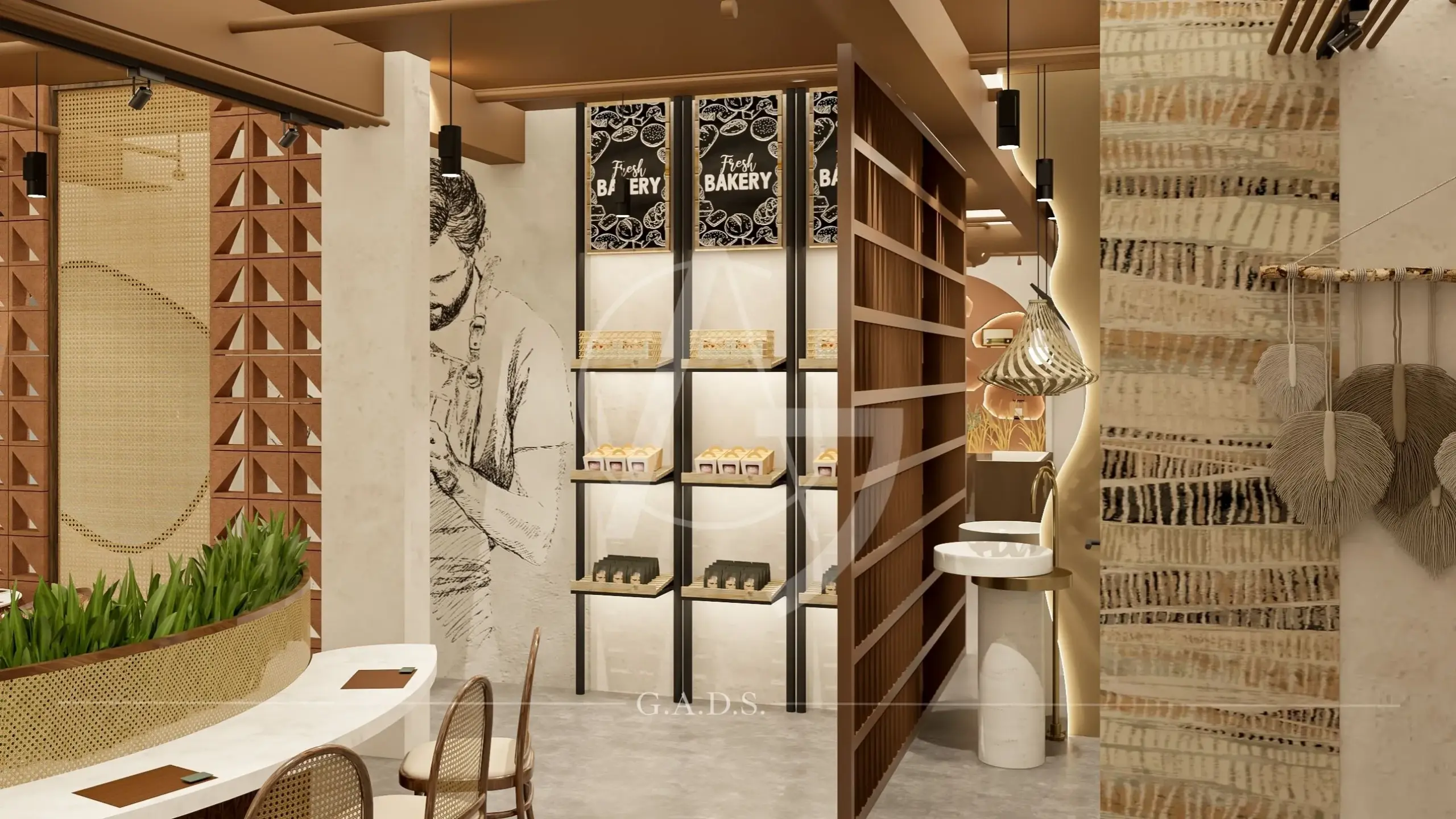 Balanced Functionality: Bakery and main counter designed with earthy finishes but enhanced with modern digital display screens.