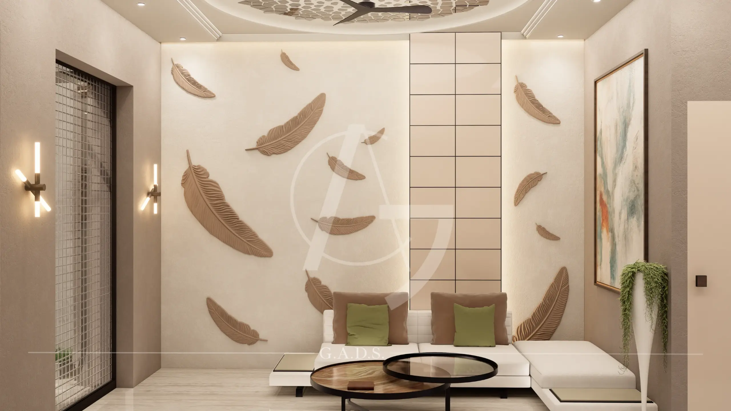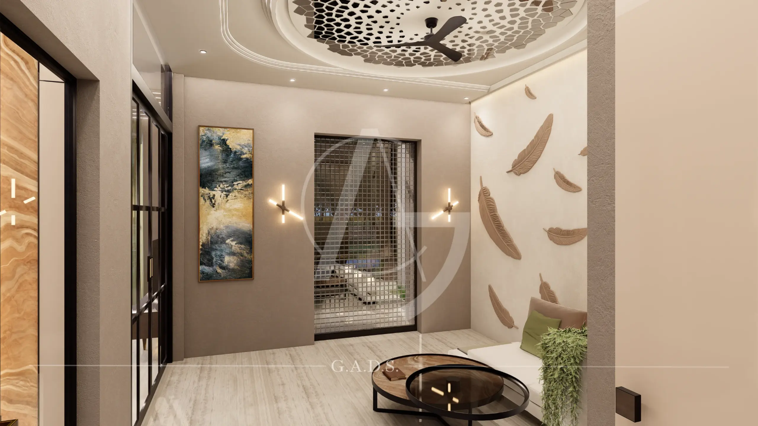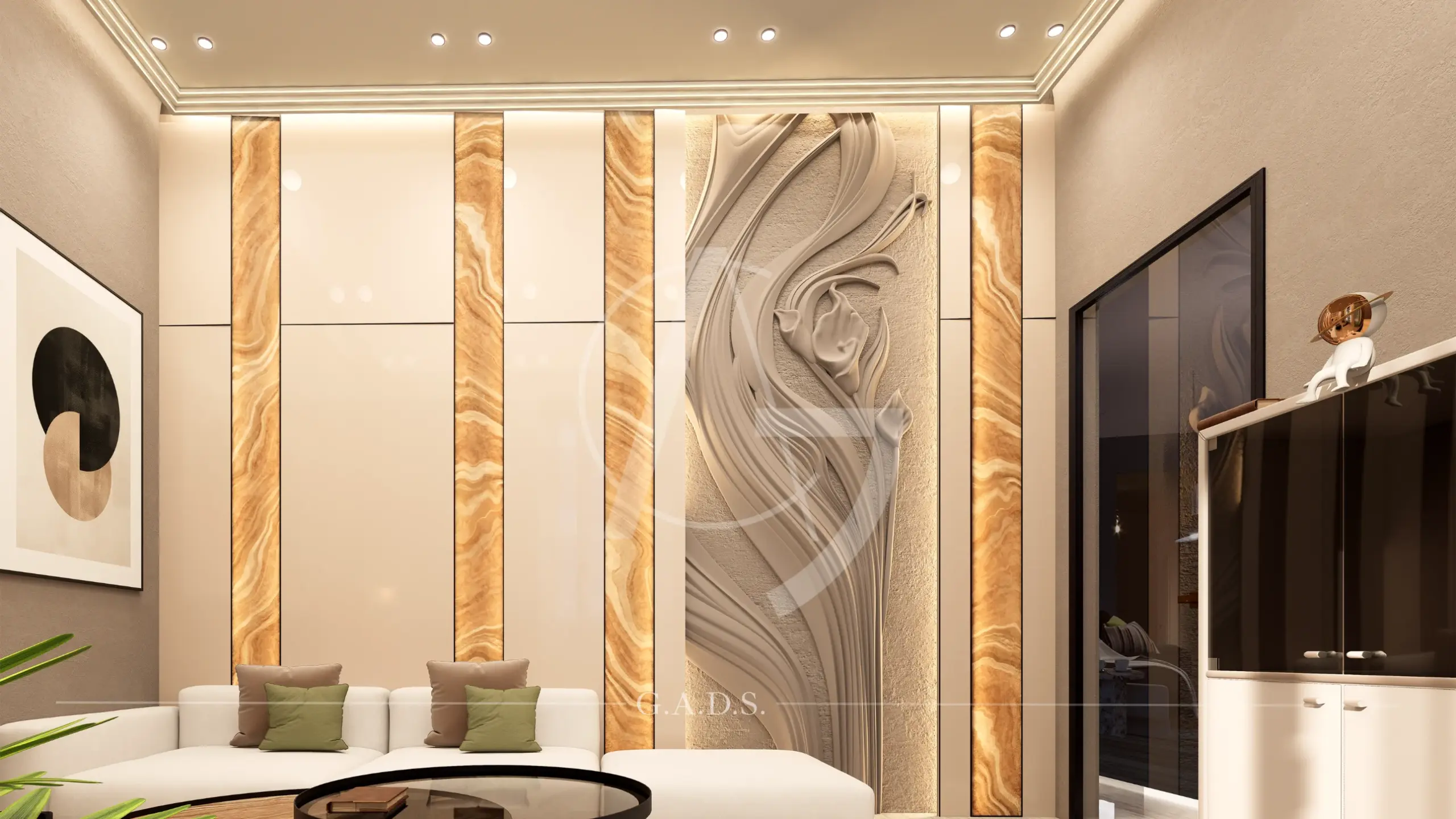 A generous open foreground amplifies its scale, while textured stone, smooth finishes, vertical fins, and subtle lighting craft a premium identity. Inside, the fluid design language continues seamlessly with curved walls, layered panels, and integrated lighting — resulting in a modern, dynamic, and sophisticated space that feels both grand and purpose-driven.