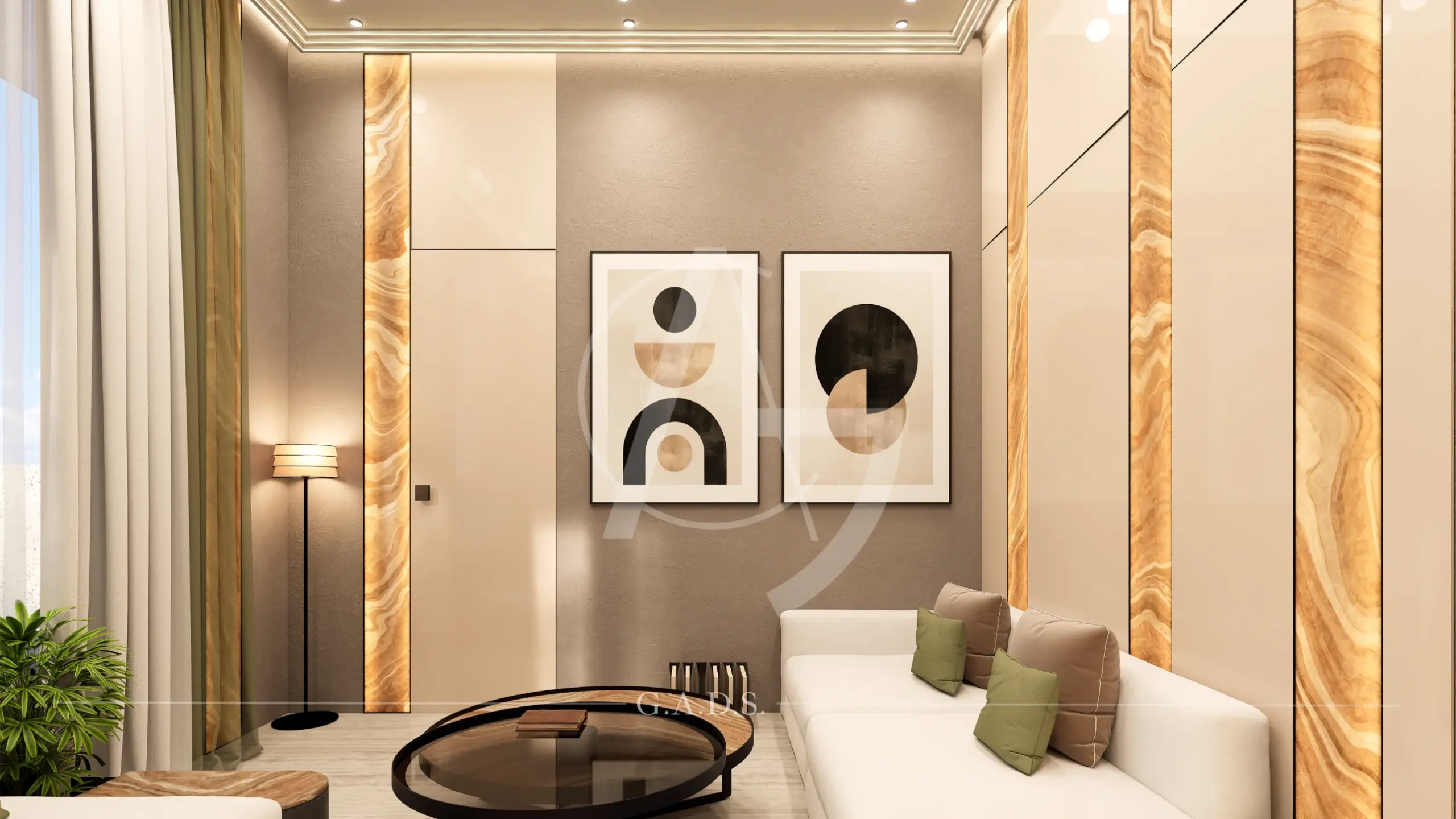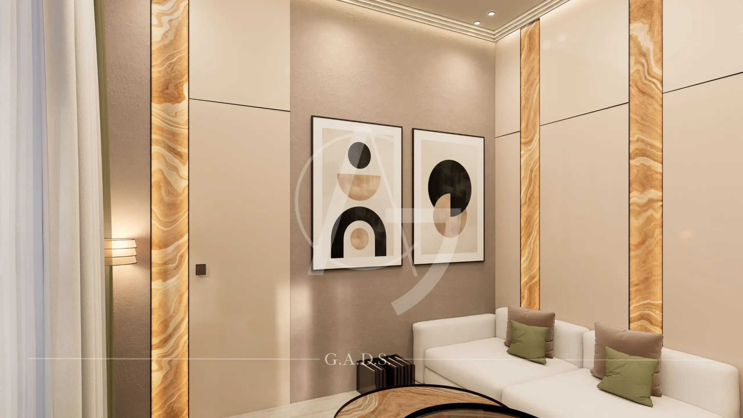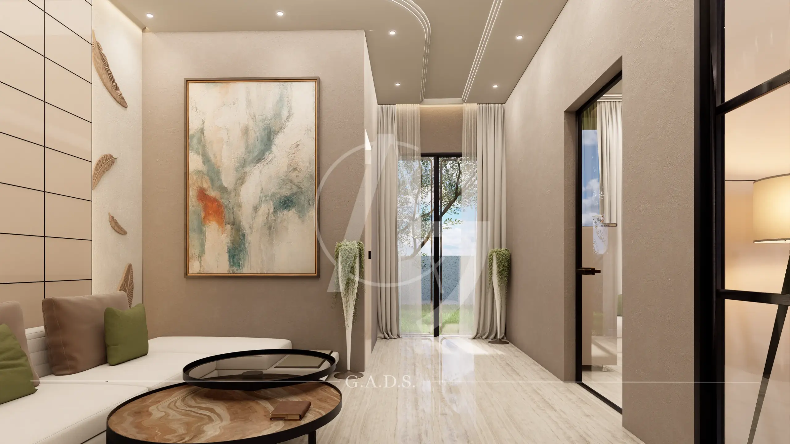 A generous open foreground amplifies its scale, while textured stone, smooth finishes, vertical fins, and subtle lighting craft a premium identity. Inside, the fluid design language continues seamlessly with curved walls, layered panels, and integrated lighting — resulting in a modern, dynamic, and sophisticated space that feels both grand and purpose-driven.